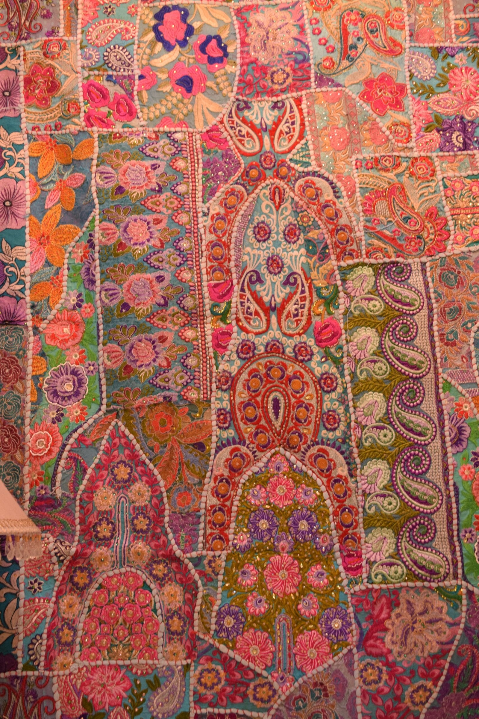 This Is a lovely overhand significant decorated decoration, handmade rectangle Tapestary. The front facet Has Multi Color Patchwork Pattern are Hand Crafted. the rear facet Is Lined With Thick Cotton That Protects the fragile Embroidery.