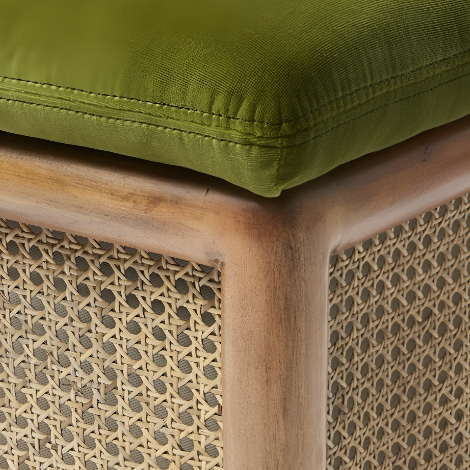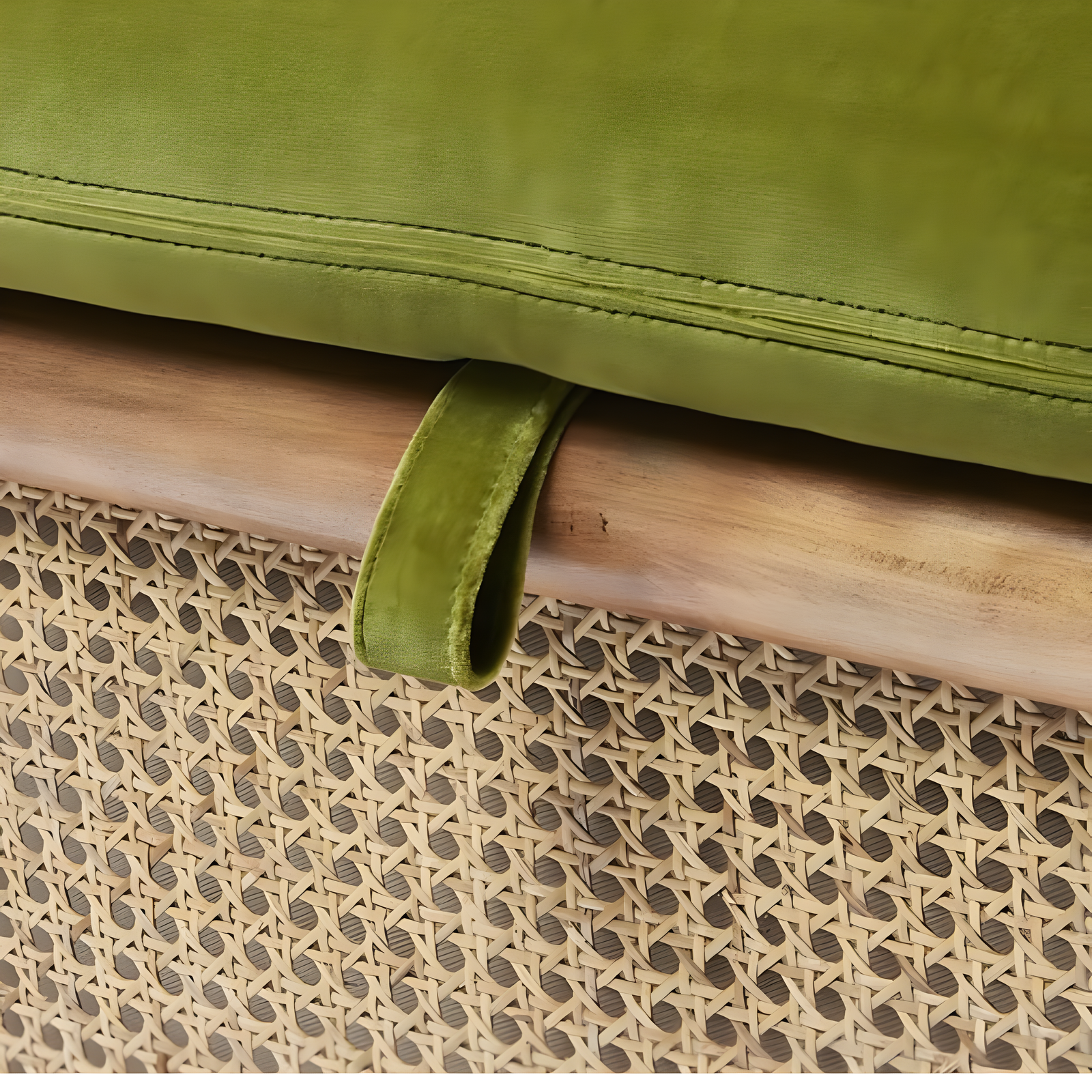 Featuring a gracefully curved design crafted from high-quality wood, the urban Rattan Seater Ottoman stands out as a stylish storage solution for your living area. Wrapped in luxurious green velvet upholstery, this generous ottoman is adorned with intricately cutout rattan cane detailing, adding a touch of sophistication to your space.